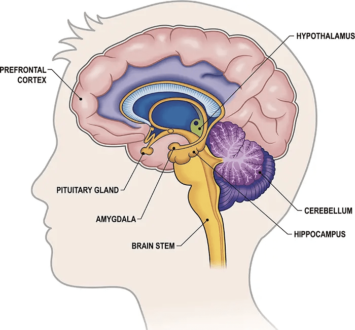 Your prefrontal cortex: is the part of your brain that deals with short term memory, time (I’m here now and before I was there), rational decision making, and accurately and planning for the future, emotional regulation, self control, and planning for complex behaviours like “I’m busy so I have to get eggs today if I want to make a pavlova tomorrow”. The prefrontal cortex is ‘modern’ in terms of evolution. It sits on the front and outside of the brain, where it developed over millenia on top of the older brain structure.